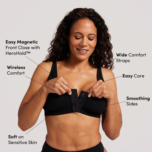 Our magnetic front-closure bras use HeroHold™ system to keep you locked in place. With a magnetic glide, the bras easily come together and stay shut all day thanks to a 3-way interlocking latch.