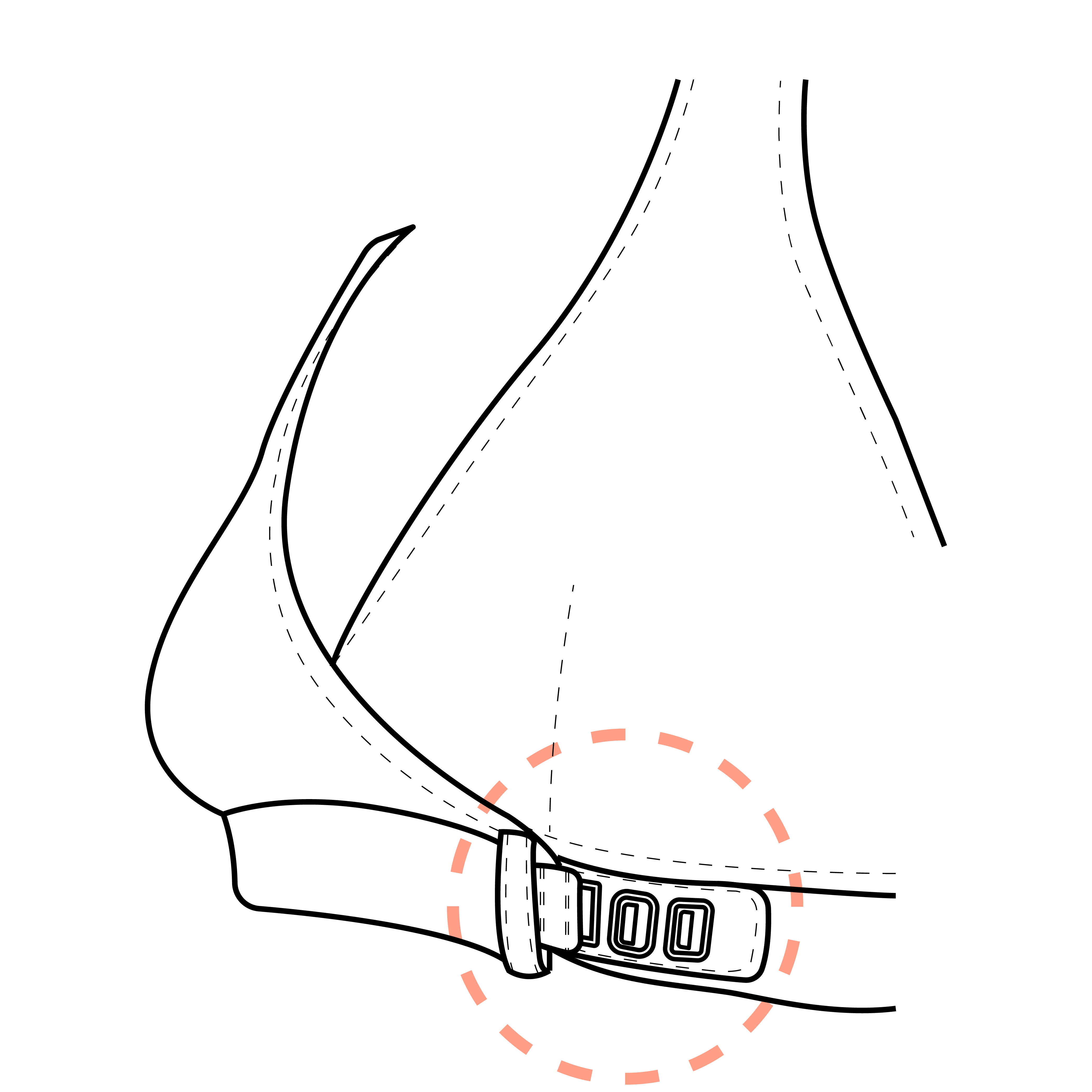 To Dress: First, completely open the garment by unfastening the clasp. Next, slip one side of the bra onto your shoulder, then the other, the same way you might put on a vest. Next, locate the small Velcro patch on your right and bring the left side across your body to attach. The Velcro also adds additional stability when fastening the other side. You may adjust the Velcro patch to fit the bra tighter or looser depending on your preference. Last, wrap the right side of the bra across your body to bring the fastener together (grip loops optional for those who need them). To close, align the "tab" side of the closure to the desired "eye" you want to use, then sink the tab into the eye and gently press to close.